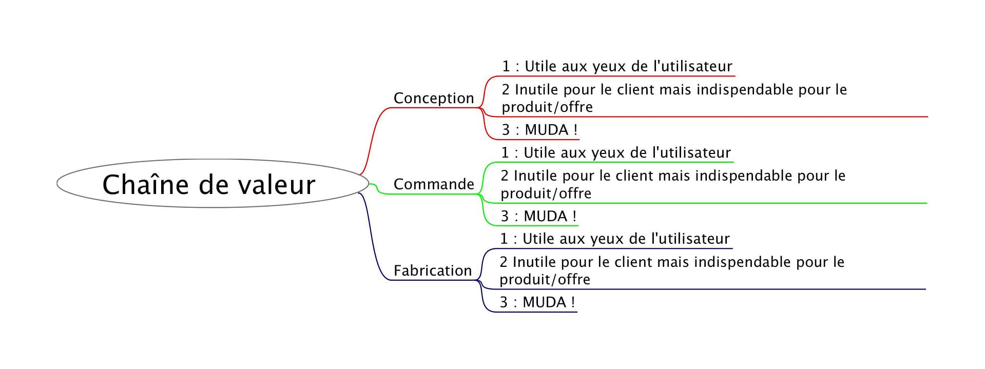 - Établir les chaînes de valeur en flux tendu en éliminant le MUDA
