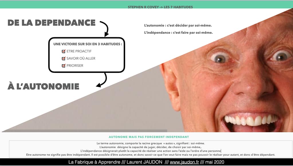 Passer de la dépendance à l’indépendance, c’est une victoire personnelle que décrit Stephen Covey dans son livre “les 7 habitudes de ceux qui réalisent tout ce qu’ils entreprennent”.