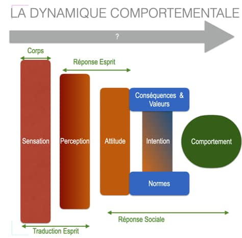 – Dans le sens commun, la flèche part de la pensée qui enclenche ou nourrit une attitude. L’attitude filtrée par l’intention, se matérialise en comportement.